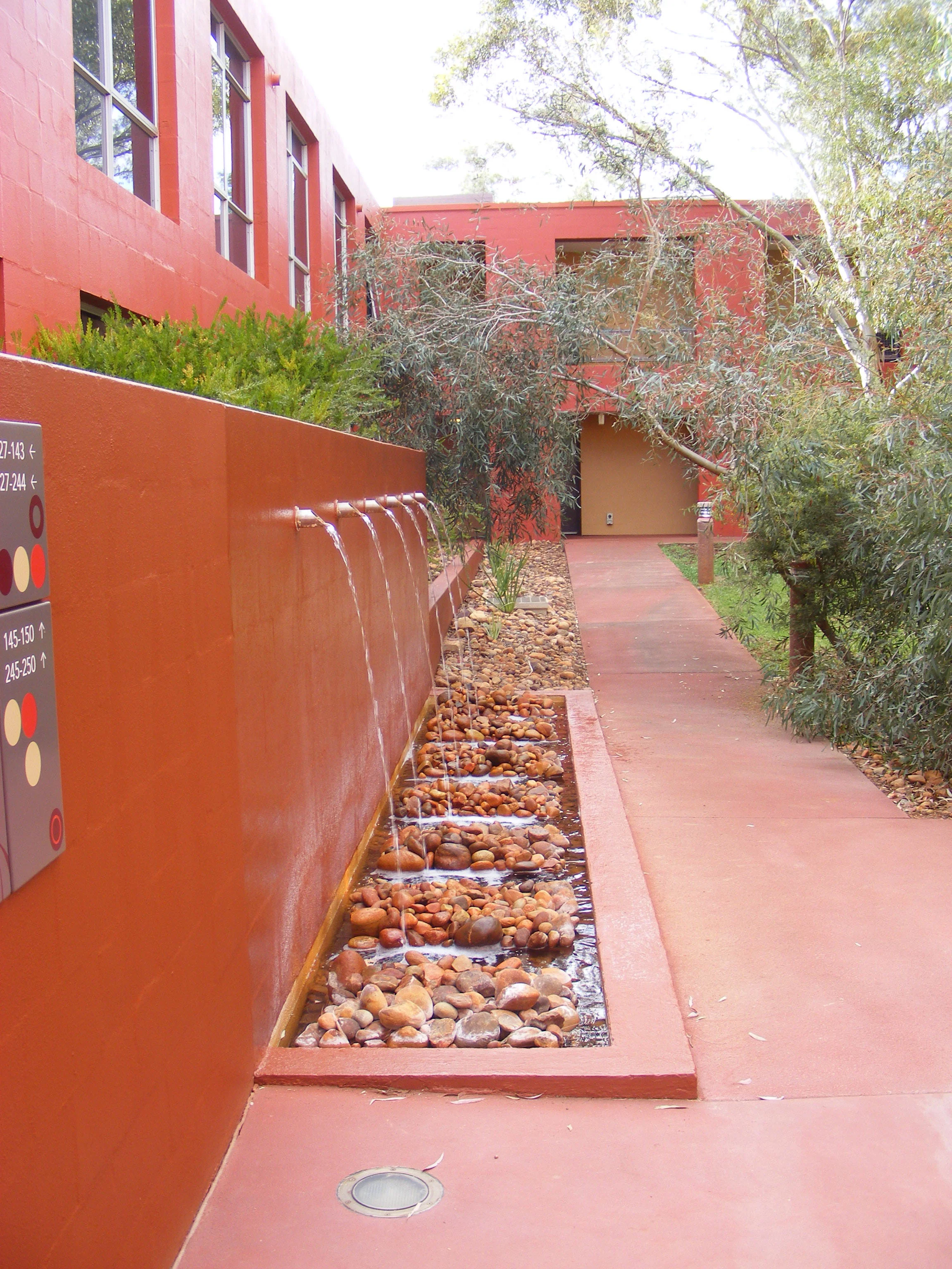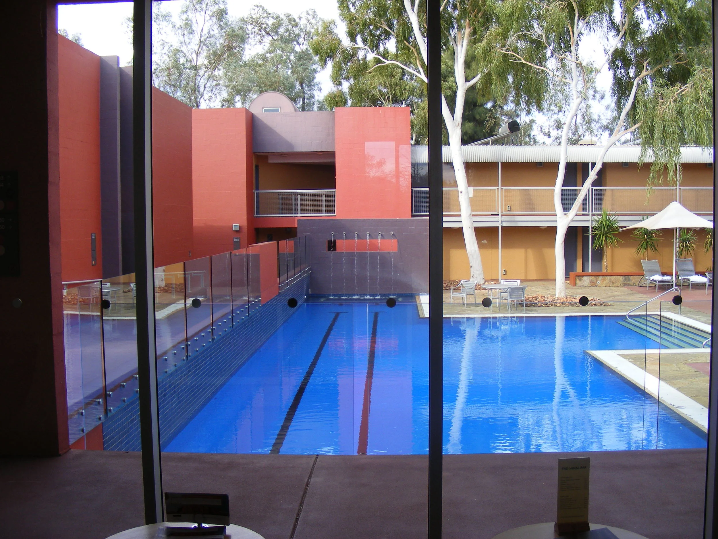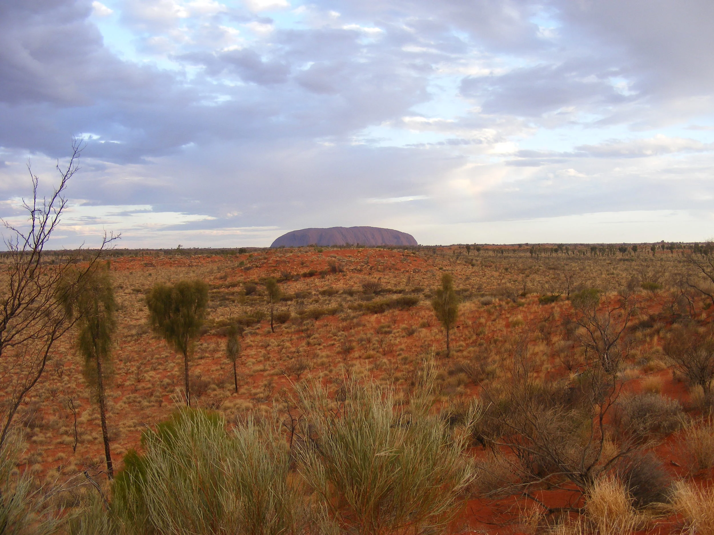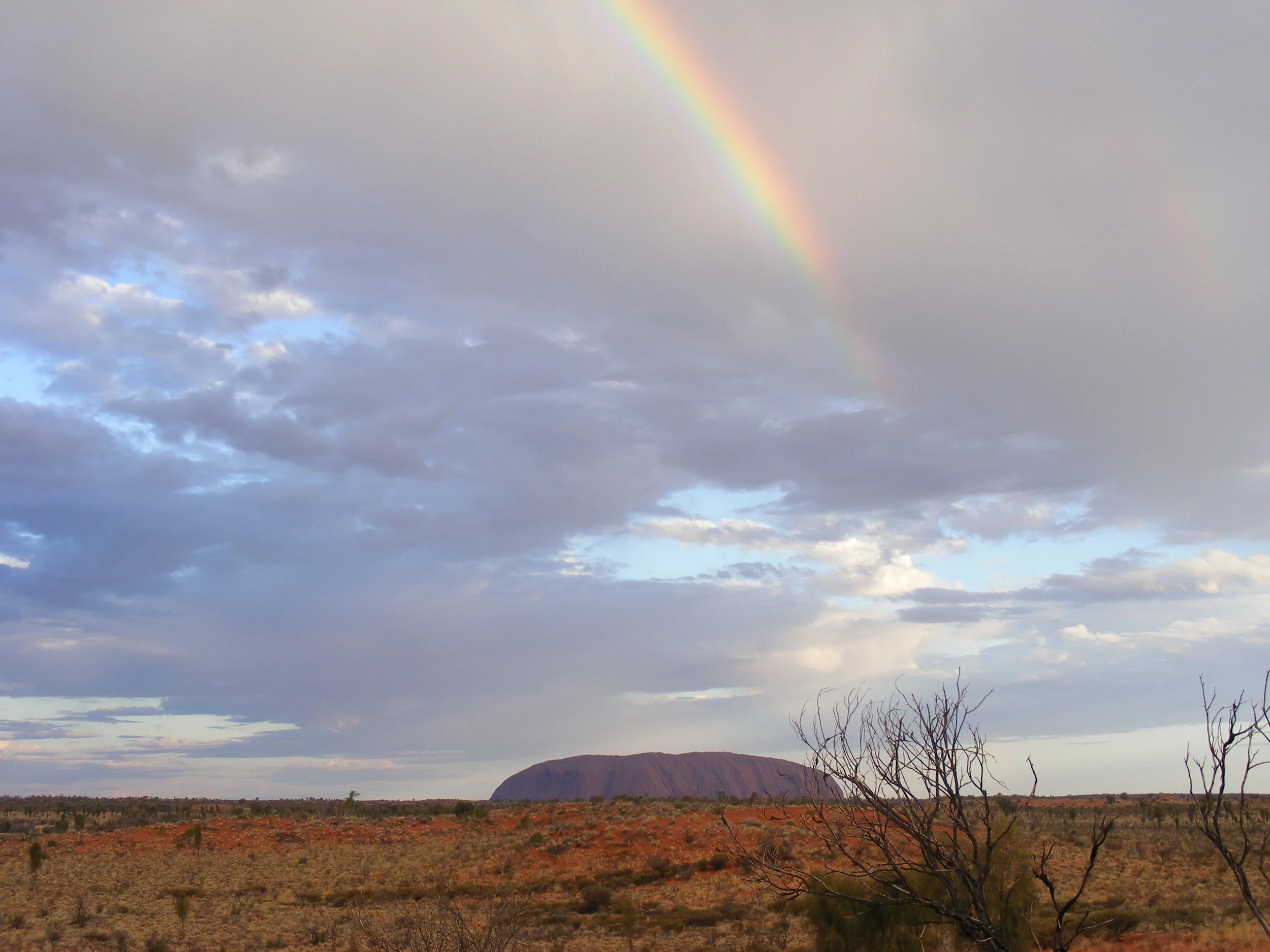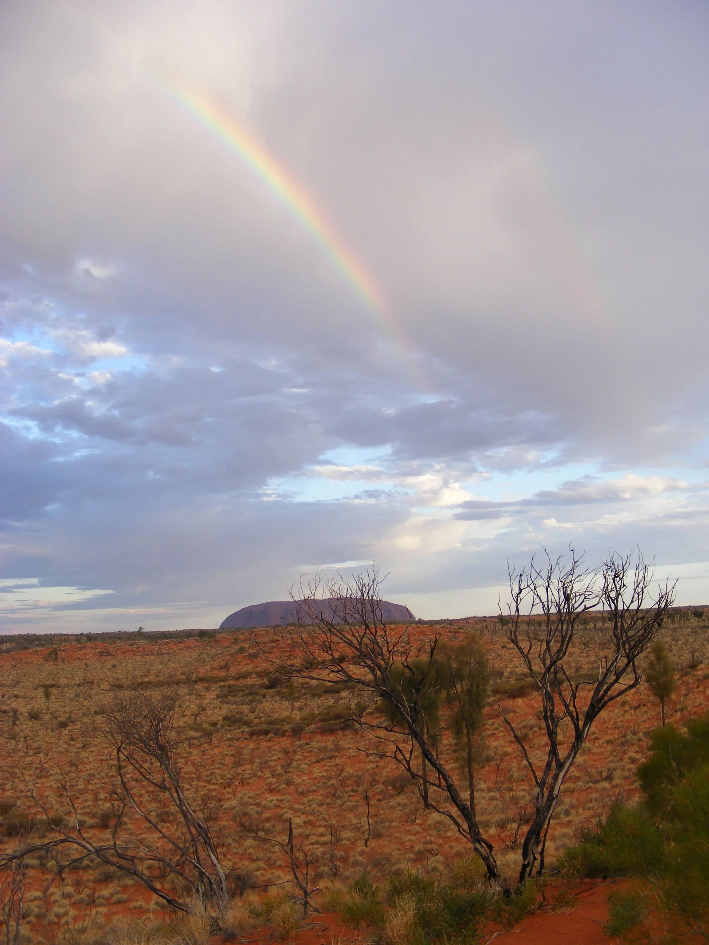 I just knew when we flew in that this was going to be the highlight of our trip. The soil was a deep red martian like dust and all the vegetation was dry bush and outback. When we got to the Lost Camel Resort we were greeted by some of the nicest hosts you could ever ask for and service was perfect. The colors and shapes of the furniture were very bold and southwest in style, as was the adobe like architecture of the place. No sooner had we dropped off our bags, we were headed on a big party bus to see the sunset at Ayers Rock (Uluru). They have not had rain here in a very long time and are in a desperate drought, so we were surprised to see it start to rain on the way there. Keep in mind that we are going to an outdoor dinner with all the trimmings, table cloths, buffet and such so this was not looking too good at this point. As soon as we arrived, we got off the bus, climbed the hill and the sight of the rock just jumped out at us through the drizzle. Suddenly it stopped raining and a double rainbow appeared over Uluru and the rock began to glow. Our hosts had open bottles and glasses of champagne for us as well as crepes of kangaroo, crocodile, and emu.