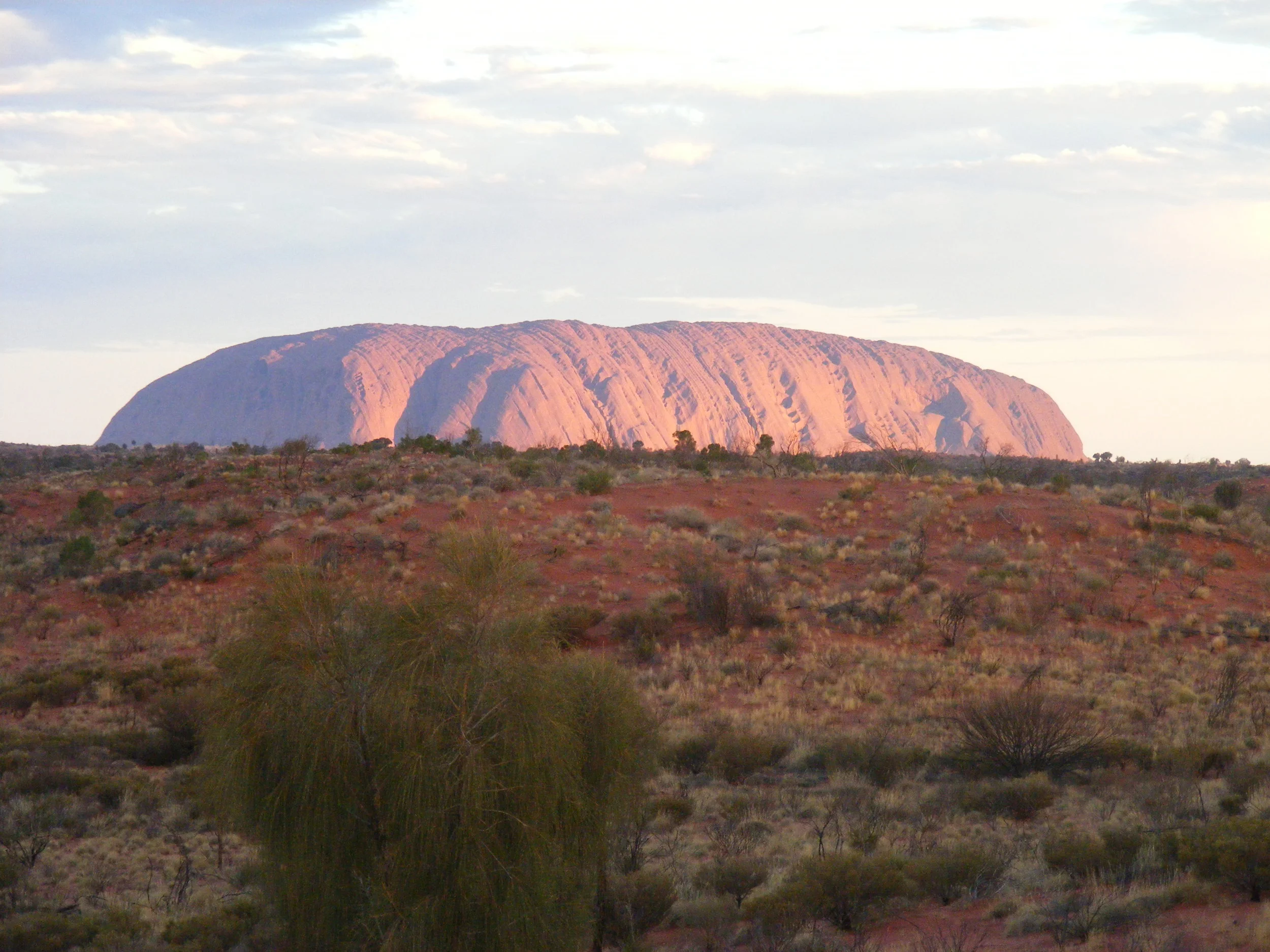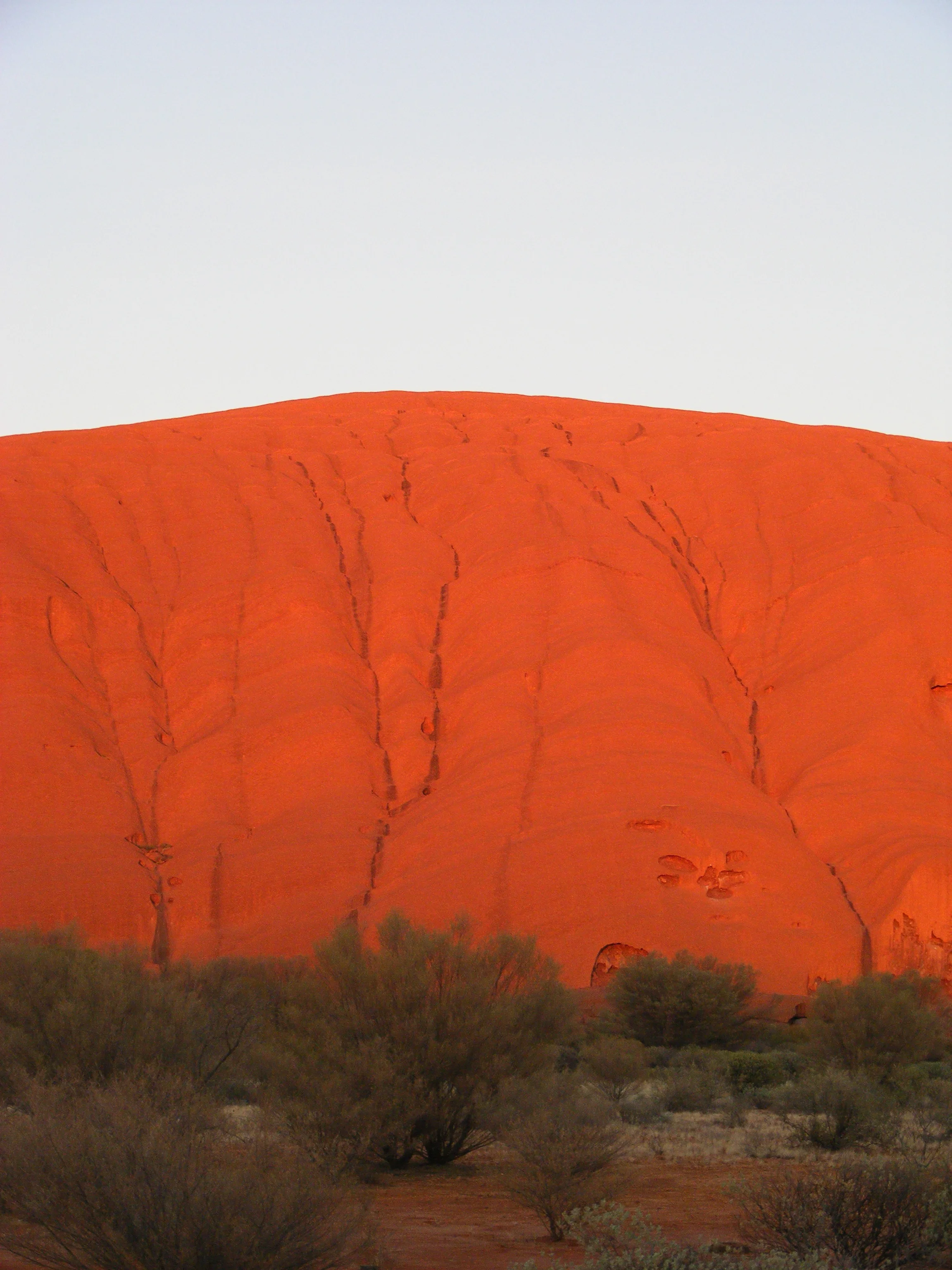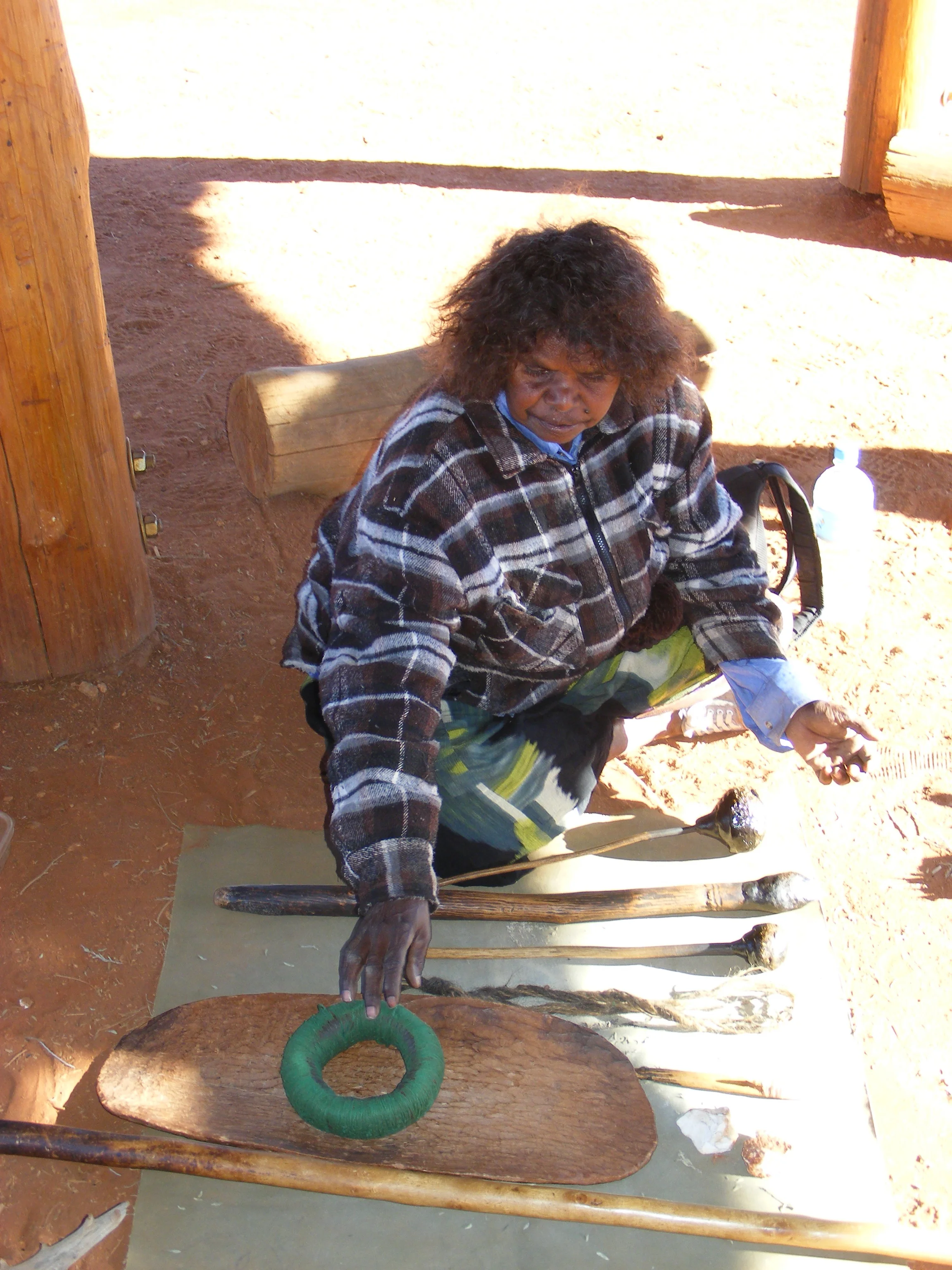 Today we were picked up for our sunrise tour of Uluru with our Aboriginal tour guide from Anangu Tours. Happy Reid was our guide and she had a New Zealander translate for her. It was incredibly cold this morning in the upper 30's to low 40's (degrees Fahrenheit). We were quite underdressed for this adventure but our guide had hot coffee and tea for us and got us to the site just in time after a wonderful breakfast. It was incredible to watch the color of the rock change with time from a deep purplish red to this bright red orange glowing ball of fire! Happy showed us the various plants and things in the bush that were used for food and hunting. She also made fire and then showed us the first glue stick that was invented over thousands of years ago from dry bush flowers ground into a powder in a wooden coolamon and then heated on a wooden stick to form a black glue used to adhere quartz stones to sticks for slicing open wild game that was caught. The glue like substance is known as spinaflex and is mounted on malga wood. It basically looks like a stick with a big black ball on the end of it. When it takes two days to carve a wooden bowl with a piece of quartz it's pretty handy to have some of this to repair any cracks that come up.